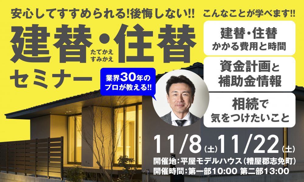 TOP 開催中のイベント開催中のイベント安心してすすめられる!後悔しない。建替・住替セミナーイベント予約制2025年10月23日(木)〜2025年11月22日(土)平屋モデルハウスオープン MODELHOUSE OPEN予約制開催中〜HAUS CONCEPT王子1丁目分譲住宅完成見学会予約制開催中〜いつでも家づくり応援相談会個別相談予約制開催中〜終了しました糟屋郡片峰中央土地情報建築条件付宅地終 了終了しましたモデルハウスで、親子DIY体験!夏休み特別企画終 了終了しました構造見学会開催します見学会終 了終了しましたHAUS CONCEPT上大利分譲住宅完成見学会終 了終了しましたビルトインガレージの家「HAUS CONCEPT別府」分譲住宅完成見学会終 了 無料相談したい 見学会に参加したい 資料請求したい